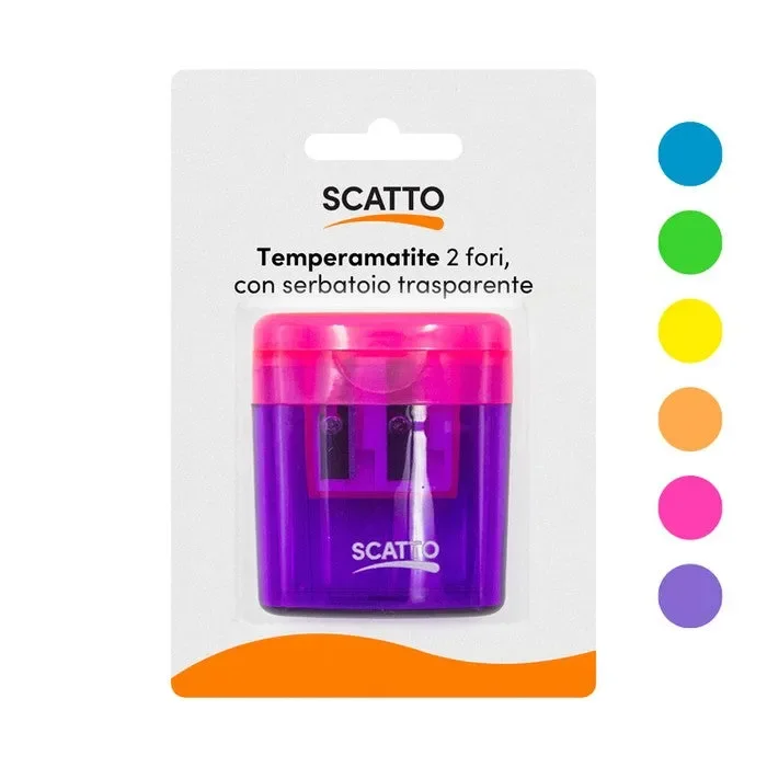 Temperamatite a 2 fori con contenitore trasparente e colorato in colori assortiti.