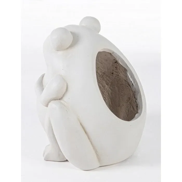 Vaso per decorazione a forma di rana con foro sulla parte posteriore, realizzato in fibra di argilla, ha un foro con tappo sul fondo per permettere la fuoriuscita dell’acqua, adatto ad uso esterno.